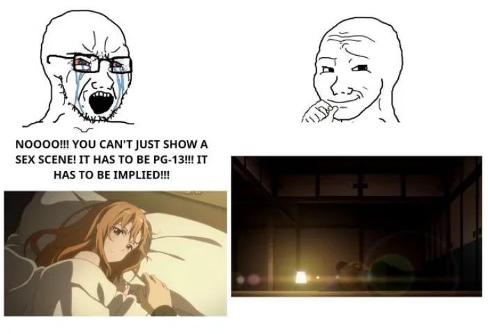 НЕЕЕТ!!! ВЫ НЕ МОЖЕТЕ ПРОСТО ВЗЯТЬ И ПОКАЗАТЬ СЦЕНУ СЕКСА! ТУТ ВОЗРАСТНОЙ РЕЙТИНГ 13+!!! НУЖНО ПРЕДУПРЕЖДЕНИЕ!!!!