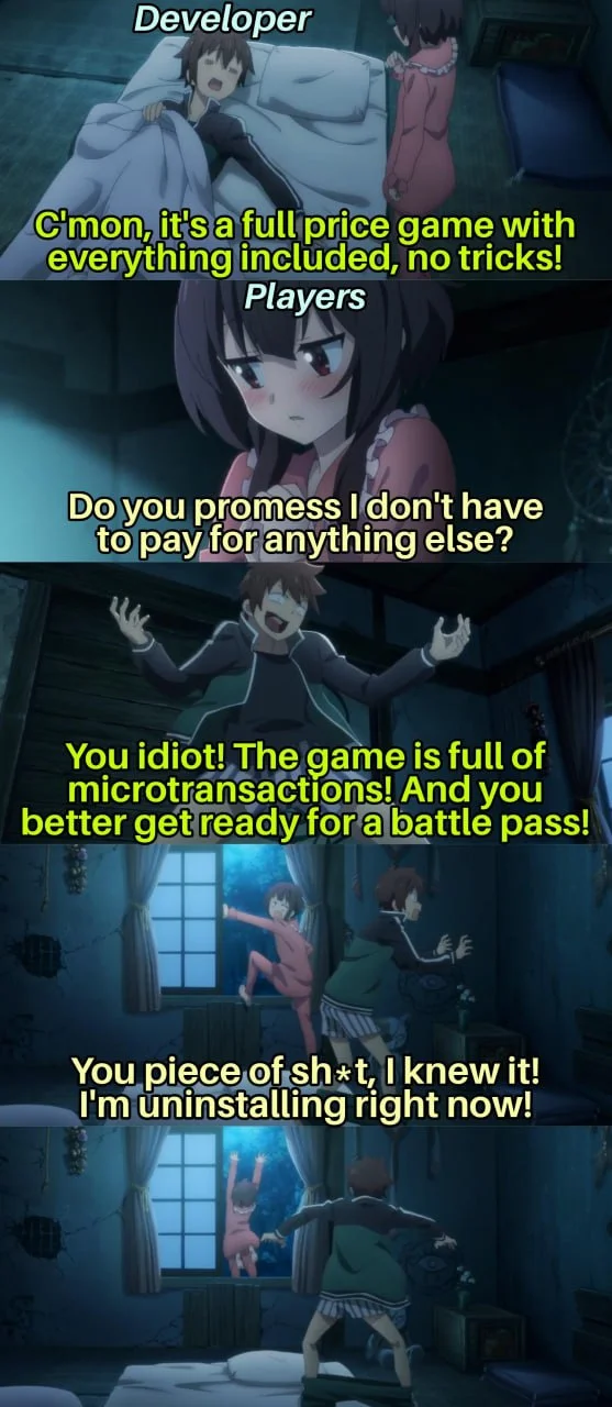 Разработчики: Идиот! Эта игра наполнена микротранзакциями! И тебе следует подготовиться к боевому пропуску!