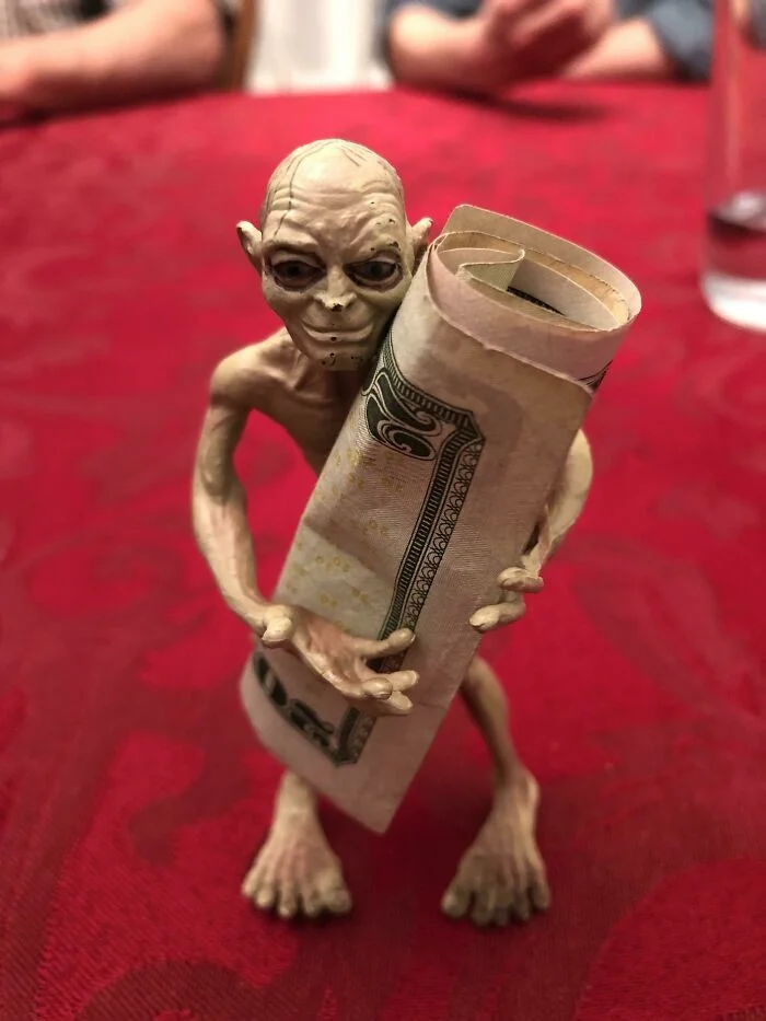 30. "Когда мы с семьей играем в карты, мы даем этому игрушечному Голлуму подержать деньги"