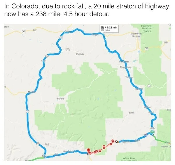 "Собирался проехать 30 километров по Колорадо в соседний город. Но из-за дороги, перекрытой камнепадом, пришлось ехать 4,5 часа в объезд"