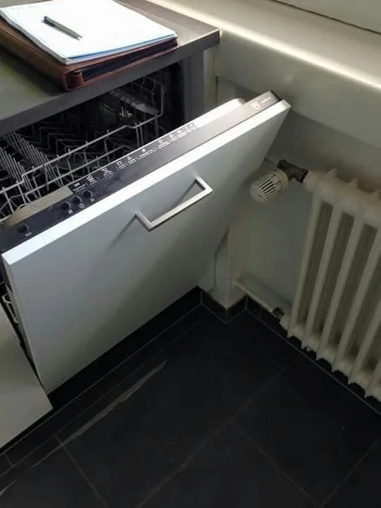 Действительно, зачем открывать дверку посудомойки ещё больше. Что называется "И так сойдёт!"