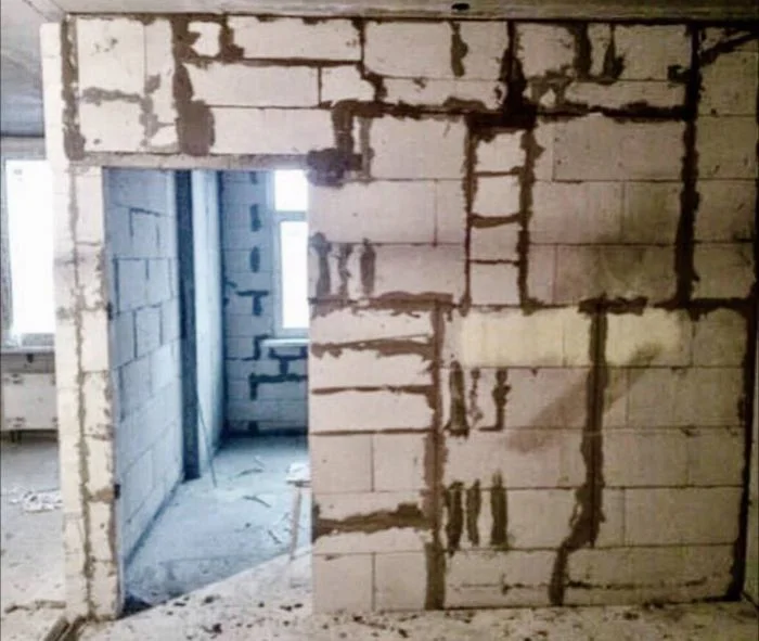 Данная перемычка тут установлена видимо для декора, так как она не несёт в себе никакого действия. Интересно, сколько она бы продержалась и не рухнула? Хорошо, что заказчик приехал на объект с проверкой раньше, чем успели зашпаклевать стены.