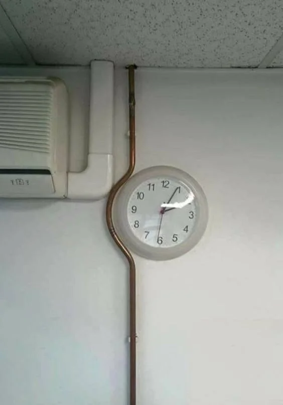 Перевесить часы для этих людей оказалось куда гораздо сложнее, чем установить трубу с изгибом в обход часов. Ах, да, часы весят не ровно, видимо всё это было напрасно и их надо перевешивать.