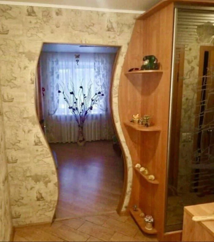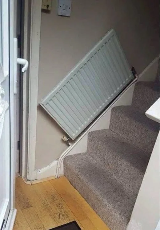 Если в первом случае со шкафом куда ещё не шло, то тут явно что-то пошло не так. Интересно, сколько людей спотыкнулось об эту лестницу выходя из двери?