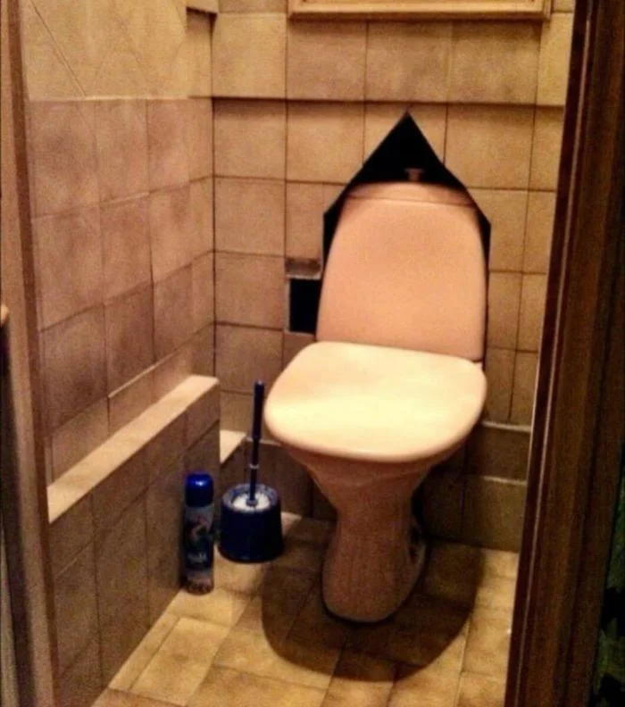 Все хотят жить в собственном домике по тёплой крышей. Видимо унитаз не исключение, так подумал плиточник.