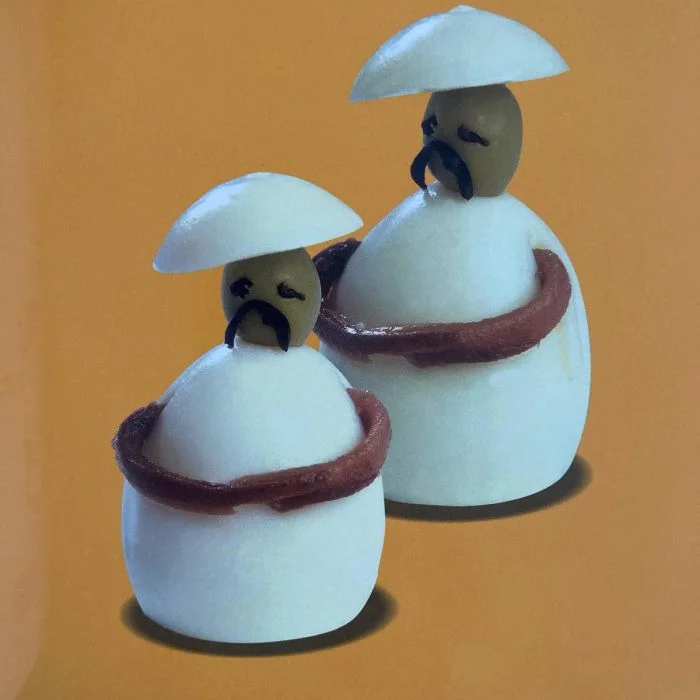 Варёные яйца с ручками из анчоуса и лицами из маслины