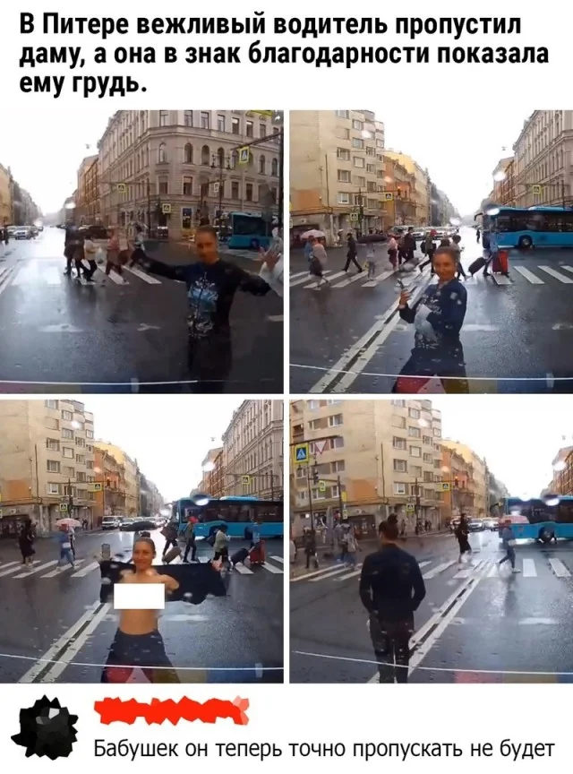 Ещё бы она сиськи не показала... Переходит дорогу вне пешеходного перехода...