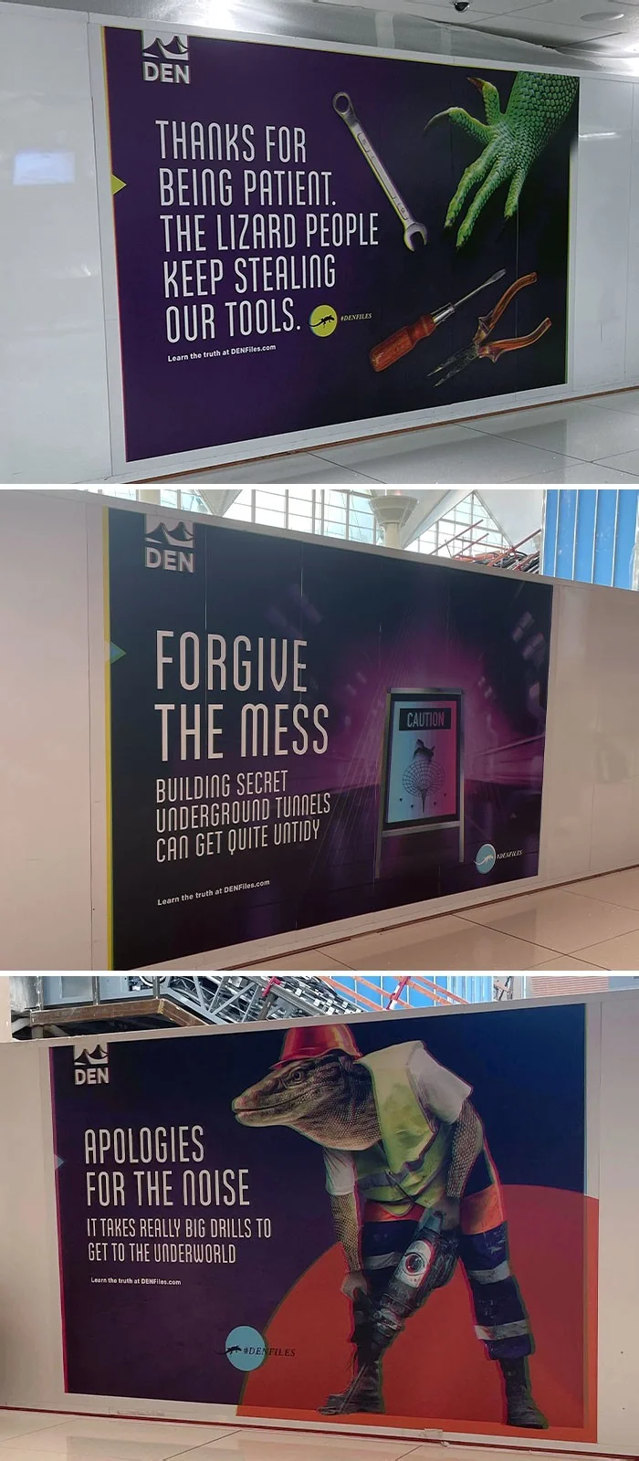 «Спасибо за терпение. Люди-ящерицы продолжают красть наши инструменты».«Простите за беспорядок. Строительство секретных подземных туннелей может быть довольно неаккуратным делом».«Просим прощения за шум. Чтобы добраться до подземного мира, нужны очень большие буры».