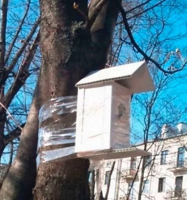 Вот ещё один пример того, что дайте вы русскому человеку скотч и он сделает из него что угодно. Получилось конечно хорошо, но вот как птичка будет залетать в скворечник непонятно. Немного что-то пошло не так и требует доработки проекта.