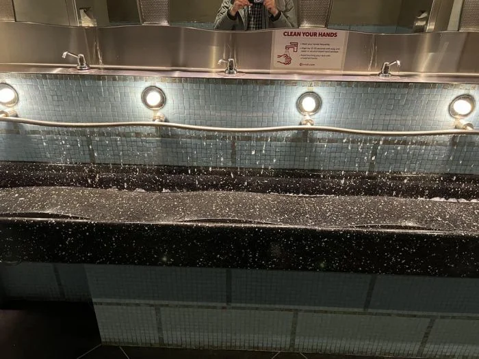 Нет, это не минималистский, авангардный дизайн. Вода просто стекает с краёв на пол, поэтому швабра тут как тут. Под этой стойкой даже нет сливной трубы.