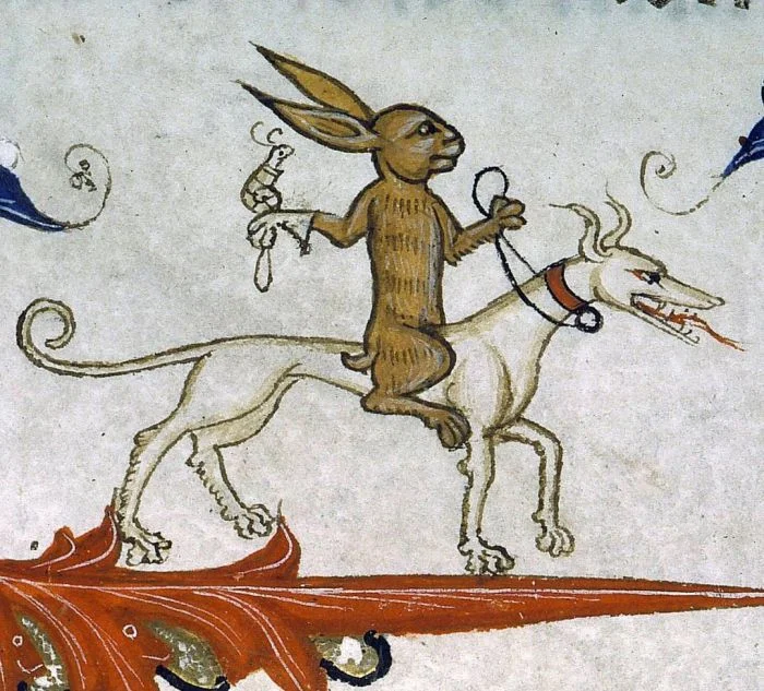 10. Заяц верхом на гончей с дрессированной улиткой, до 1390 года