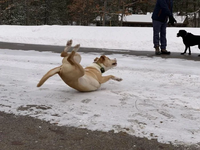 Наш пёс не рассчитал силы на обледенелой дорожке.
