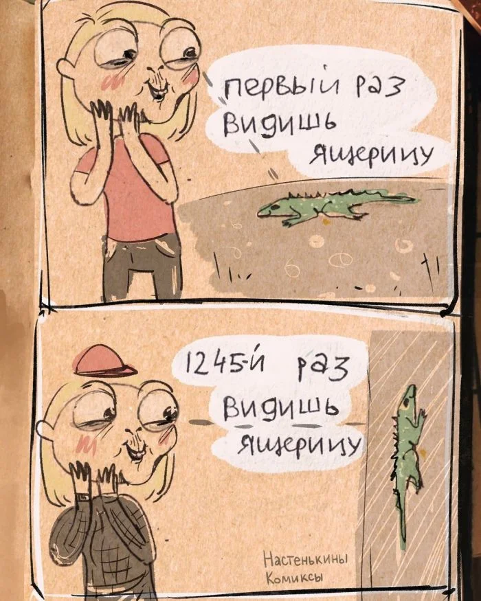 Анастасия Лемова — создательница сообщества «Настенькины комиксы». Её работы — это забавные иллюстрации из жизни дизайнера на удалёнке, наполненные лёгким юмором и самоиронией. Анастасия известна благодаря популярному мему «Не надо так» и авторству двух книг. В новой серии рисунков она снова с точностью подмечает ежедневные моменты, знакомые каждой девушке.