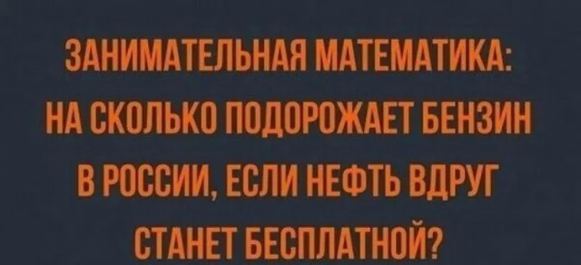 Если нефть станет бесплатной, то бензин подешевеет примерно на 20%, это стоимость сырья из общей цены бензина.