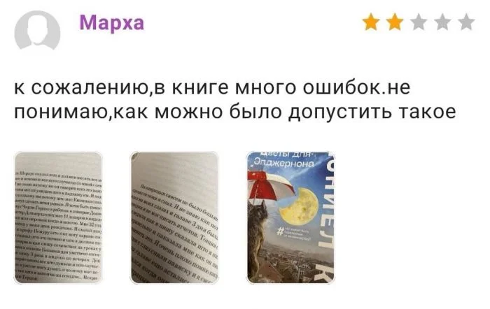 Маркетплейсы помогают выбирать товары, потому что покупатели оставляют отзывы. Однако порой по этим самым отзывам можно понять умственные способности читателей. Пользовательница Олеся Полевая предлагает интересный способ: "Если вдруг в минуту душевной слабости вы почувствуете себя самым тупым человеком на свете, обязательно зайдите на Wildberries почитать отзывы покупателей о книге "Цветы для Элджернона"".