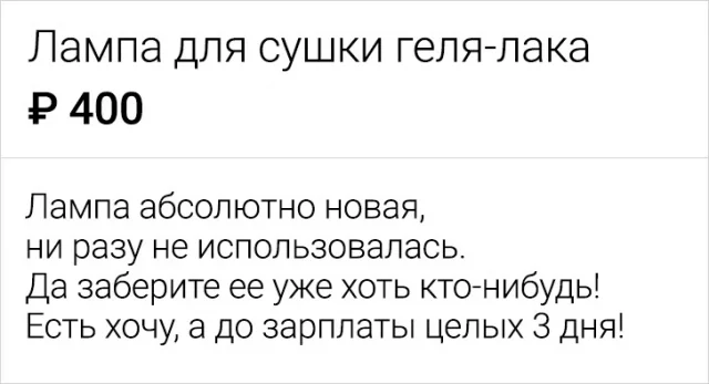 Покупать и продавать вещи в интернете - это дело обыденное. Однако, порой, это очень весело, так так как иногда встречаются такие кадры, что диву даешься. Давайте поднимем себе настроение и поглядим подборку смешных объявлений с просторов Сети.
