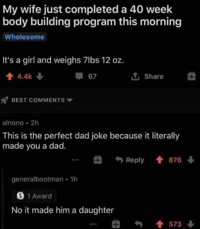 — Эта шутка — идеальный пример отцовского юмора, потому что она буквально породила отца.