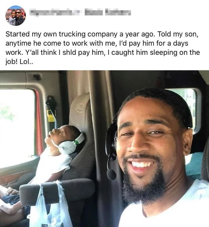 20. «Год назад я основал собственную грузовую компанию. Сказал сыну, что буду платить ему за дни, отработанные со мной. Обнаружил его спящим на посту, как думаете, стоит ли ему платить?»