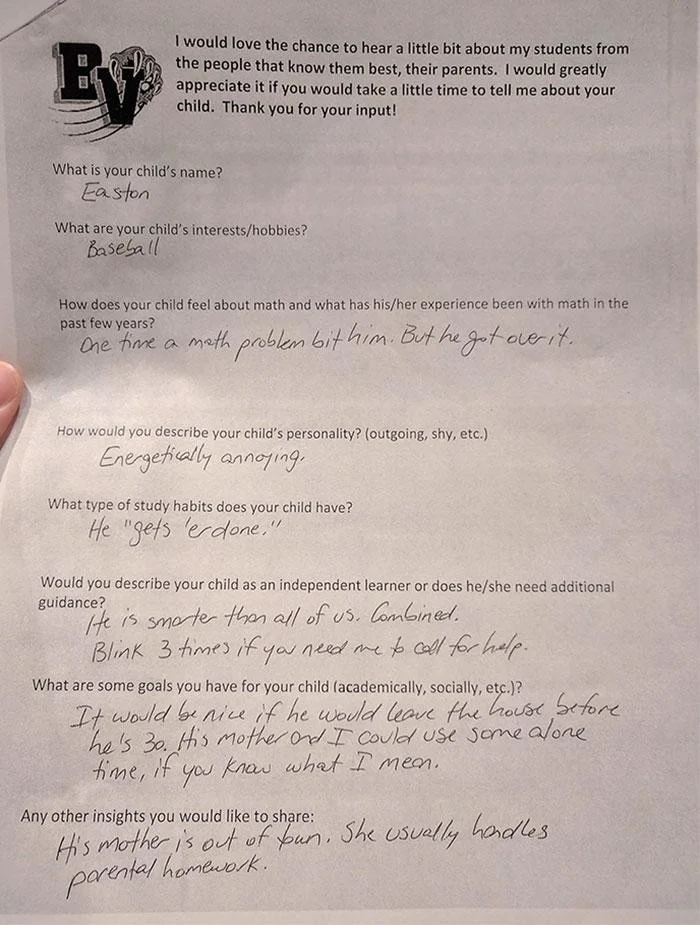Как зовут вашего ребенка?ИстонКакие у него увлечения и хобби?БейсболКак ваш ребенок относится к математике, и как складывались их отношения последние несколько лет?Однажды его укусила задачка по математике. Но он это пережил.Как бы вы описали характер вашего ребенка?Энергично-бесячий.Как ваш ребенок справляется с учебой?Он ее «приканчивает».Вы бы скорее назвали вашего ребенка самостоятельным, или ему необходима помощь в учебе?Он умнее всех нас. Вместе взятых.Моргните трижды, если нужно вызвать подмогу.Какие цели вы ставите перед ребенком?Было бы неплохо, если бы он переехал до того, как ему исполнится 30. Нам с его матерью не помешает уединение, если вы понимаете, о чем я.Любые другие мысли, которыми вы готовы поделиться:Его мать временно уехала. Обычно домашней работой для родителей занимается она.