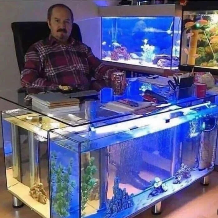 8. Рабочий стол с аквариумами — отличный способ отвлечься от работы