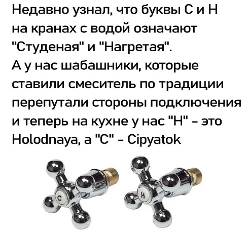 Откуда бл*ть взяли Студёная и Нагретая? Ладно бы Горячая и Холодная. Всю жизнь краны различаются цветом: красный и синий.
