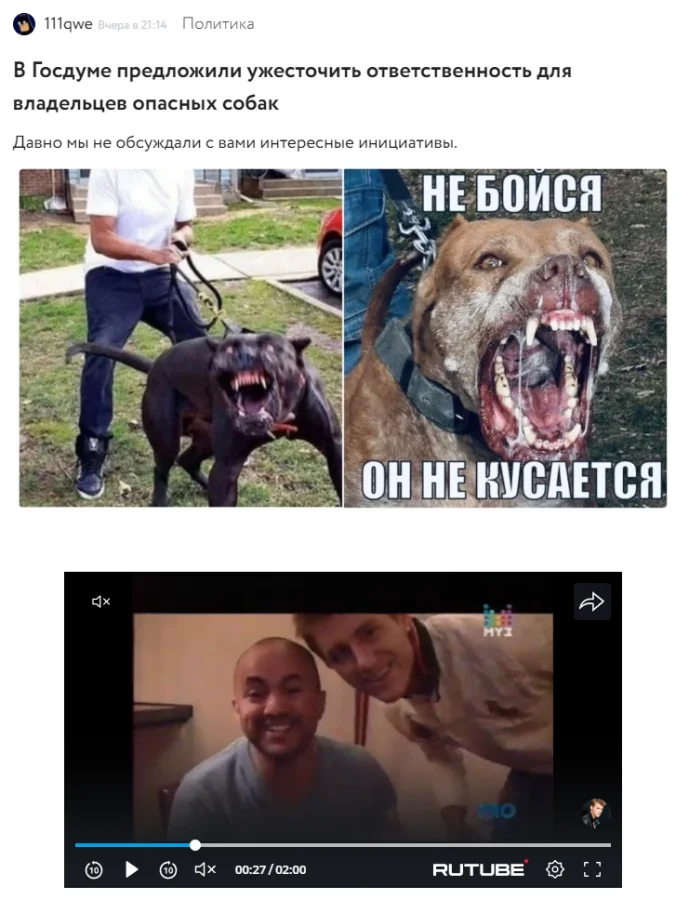 При просмотре постов идет реклама в роликах с RUTUBE, в которых периодически появляются моменты, забавно иллюстрирующие информацию в постах от Crazy и NikoniX.