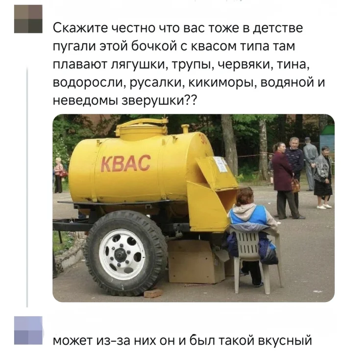 , Это в современной России ходит байка, что в советской России не мылись бочки из под кваса-молока-пива. Даа, того бы квасца я б нaeбнyл. 36 копеек трёх литровый бидон, 40 копеек полный.