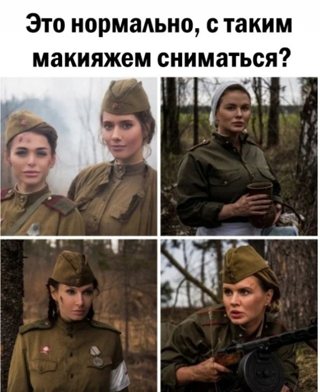 про макияж в фильмах: зависит от фильма, аудитории и целей. Если всё художественное и нужно показать современному школьнику, что девки тогда были красивые, даже на войне - то допустимо (хоть и все эти процедуры на лице, штампованные губы, заточенные брови вызывают в целом буэ-эффект, лично у меня).