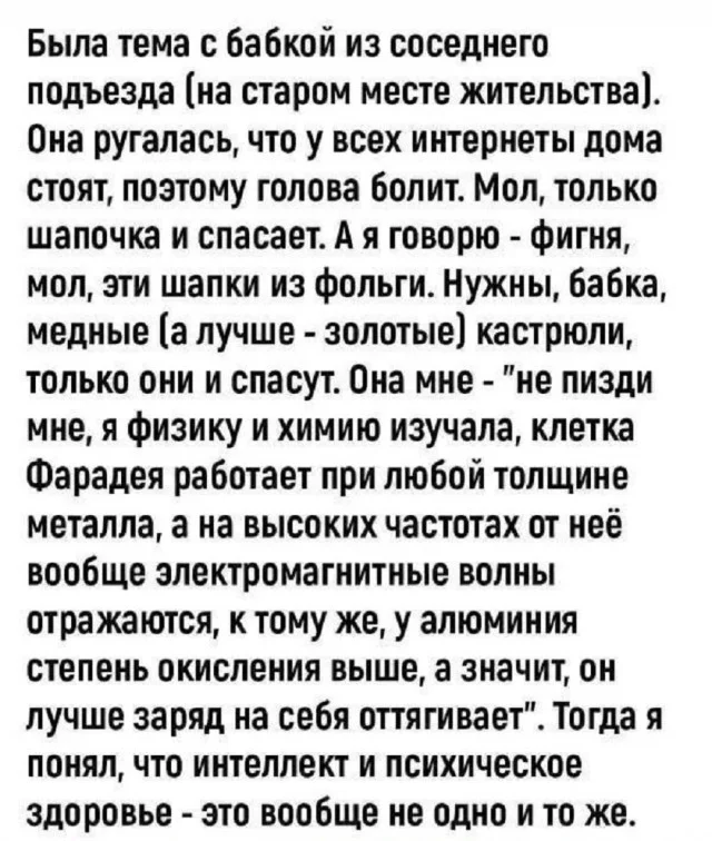 Раз бабка изучала физику, то она хоть как должна быть осведомлена, что естесственный радиофон земли повыше будет влиять на человека, чем интернет. Более того, не зря придумались всякого рода витые пары, хорошо экранированные интернет провода - чтобы от помех защитить интернет, а не наоборот.