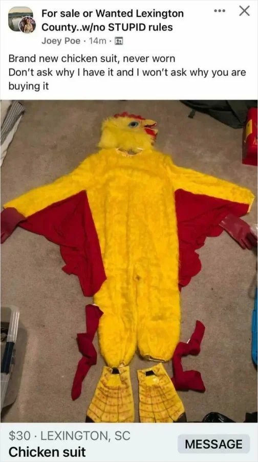Совершенно новый костюм цыпленка. Не спрашивайте, откуда он у меня, и я не стану интересоваться, зачем он вам.