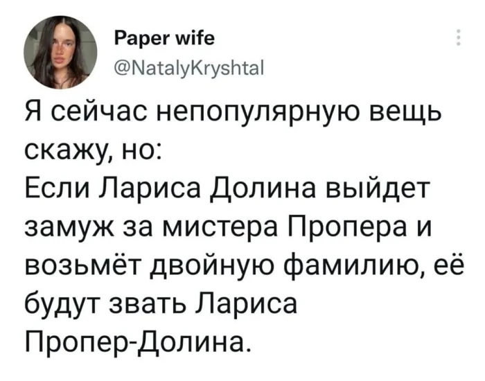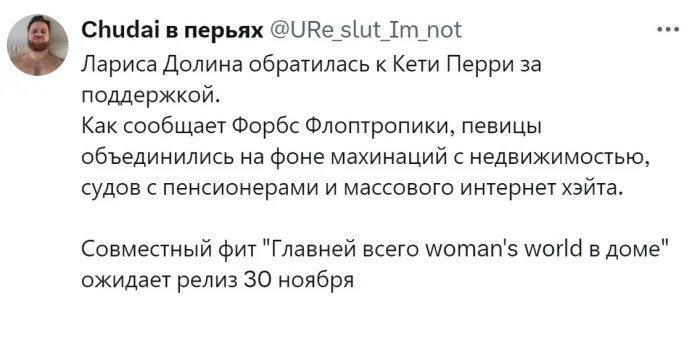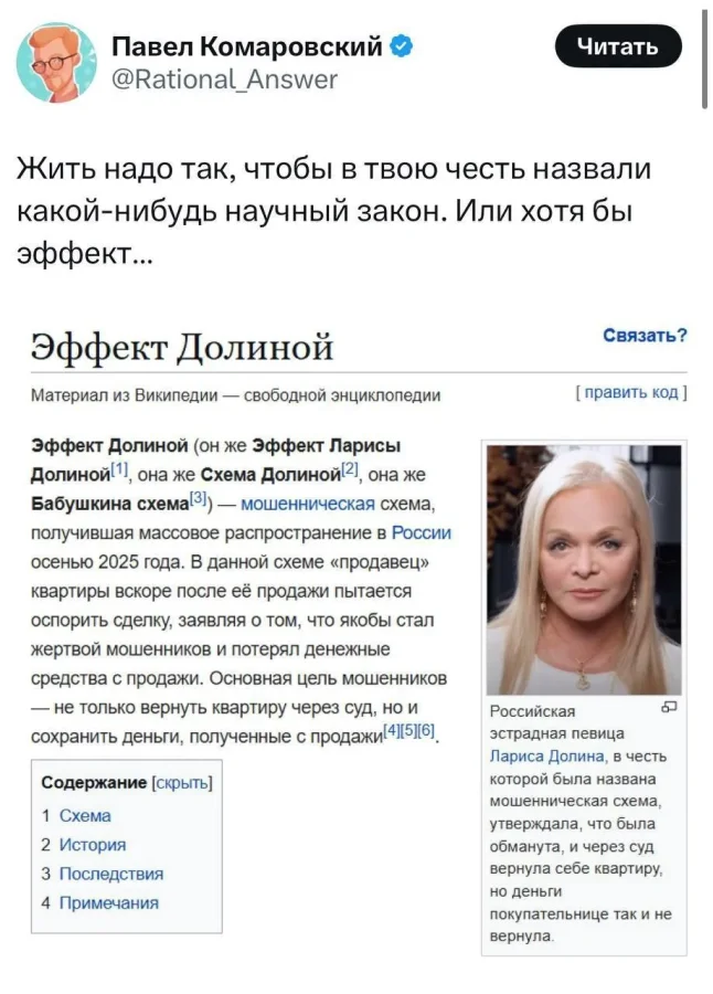 Лариса Долина вызвала неоднозначную реакцию среди россиян, объединив их в едином порыве негодования, независимо от их политических или социальных взглядов. Ее действия привели к настоящему хаосу на рынке недвижимости. Как обычно поступают в таких случаях? Естественно, начинают активно искать и создавать мемы, чтобы смягчить ситуацию с помощью юмора.