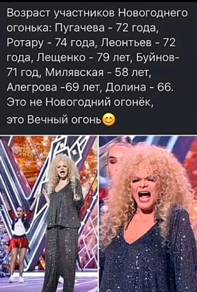 12 - Пугачевой 76 лет и как минимум с февраля 22-го года она ни в каких огоньках не снимается. Как и Ротару. Маразматички xyeвы.