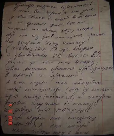 Здравствуй Дедушка Мороз (он же г-н Цукер) У меня все хорошо, а как дела у тебя? Мама с папой бьют меня и не пускают гулять. Еще мне надоели эти странные люди, которые орут мне под ухо! Пожалуйста, пришли мне Дедушка мороз машину(Ford Mustang 67г.в. с двигателем V12 объемом 6.0л., разгон до сотни менее 4 секунд, цвета «Хамелеон» оранжевого переходящего в красный)! А еще подари мне пожалуйста «Набор милиционера»(хочу ту кожаную палку(полосатую) и гламурные розовые наручники(с мехом)) и не забудь про ВАЗЕЛИН!!! А еще подари мне снегурочку(90-60-120)! А еще подари мне Золотую карту в Швейцарии и положи на счет 3млн Европейских тугриков и пробей череп арматурой соседу, за то, что он громко слушает музыку, когда я ложусь спать! Пока мутант!