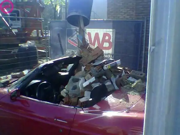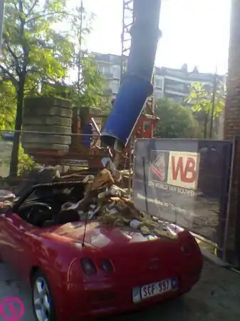 Не буду даже делать предположение, кто был за рулем этой машины. Но место для парковки водитель выбрал явно неправильно. Как раз под строительным рукавом по которому спускают на землю весь мусор с верхних этажей. Строители ребята простые, они каждый раз проверять не будут все ли чисто внизу. Результат налицо :) P.S. машинку жалко
