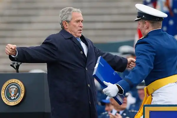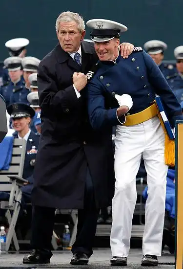 На фотографии агентства Associated Press самый неформальный президент мира Джордж Буш запечатлен во время ритуального приветствия «грудью о грудь» (chest bumping) с одним из выпускников академии US Air Force.