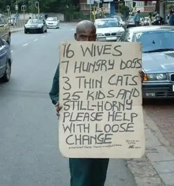 16 жен, 7 голодных собак, 3 тощих кота, 25 детей и все еще испытываю влечение. Пожалуйста помогите немного мелочью