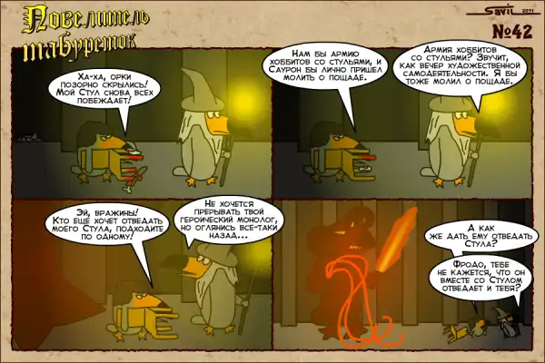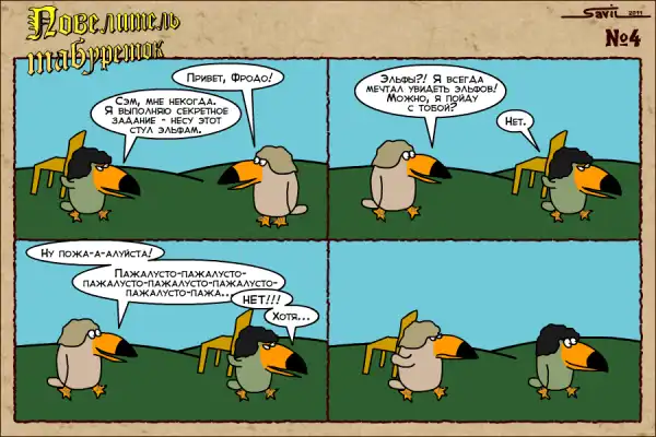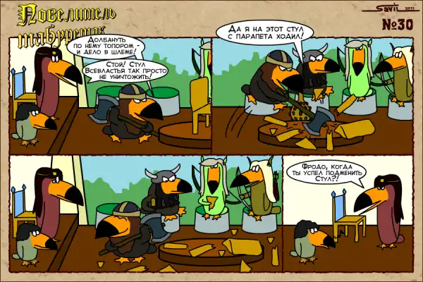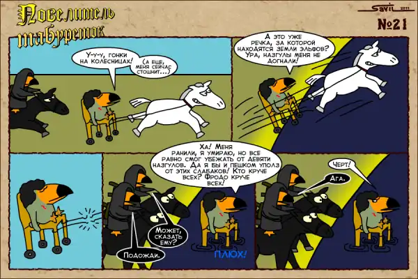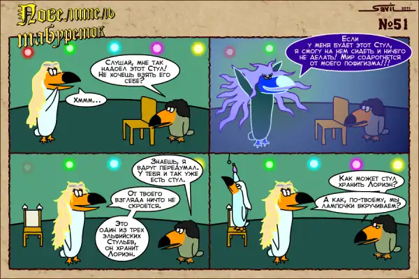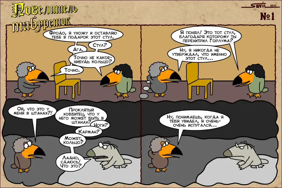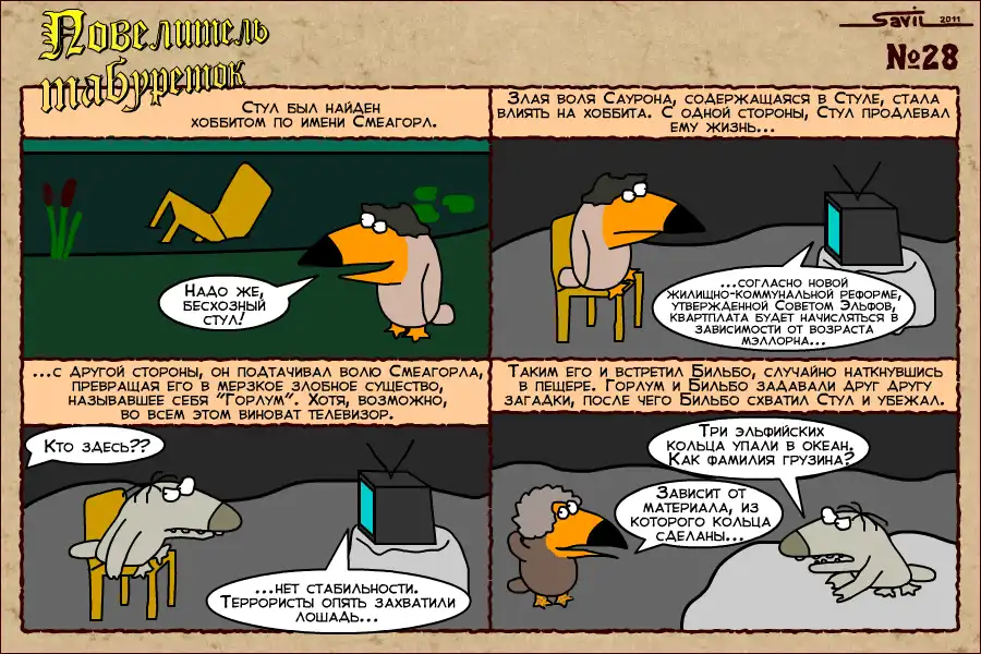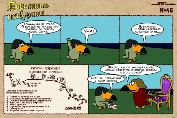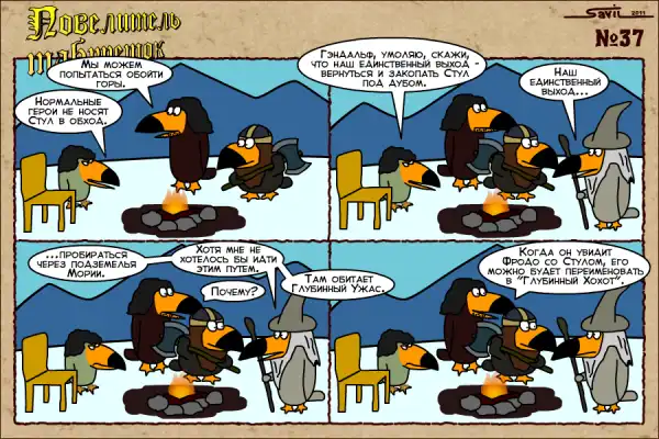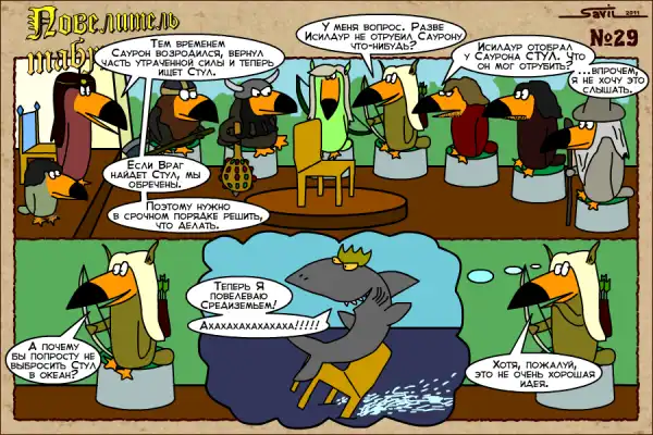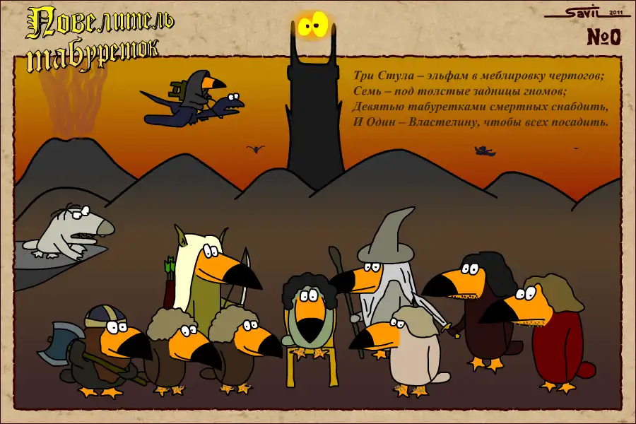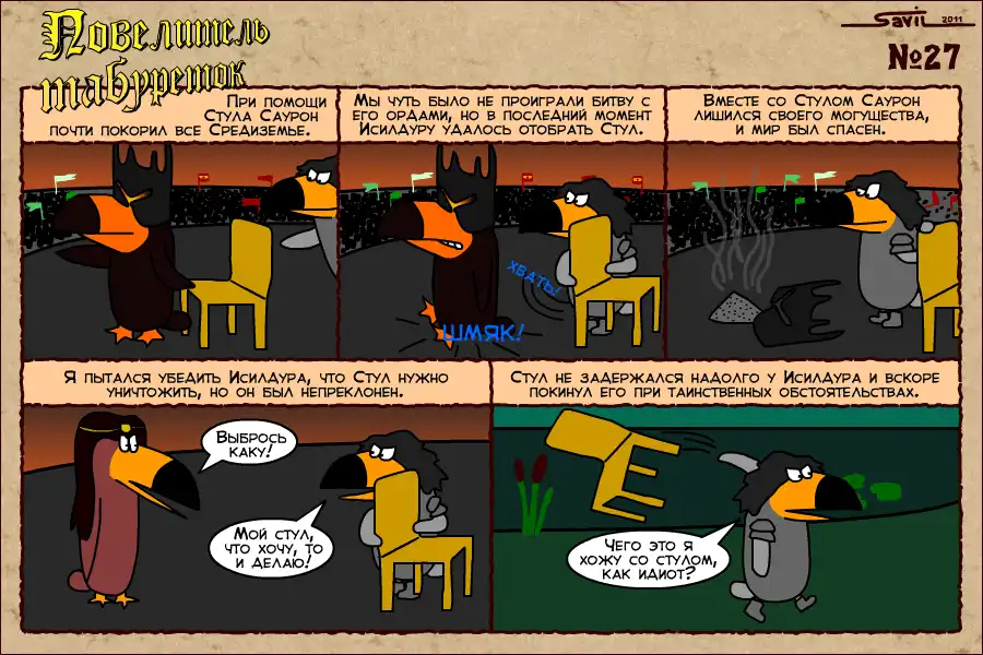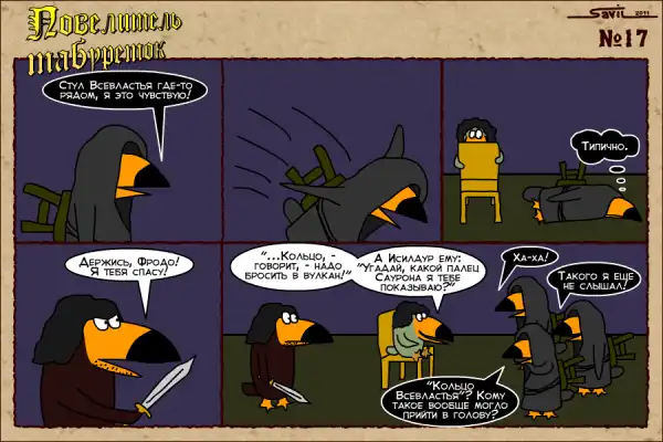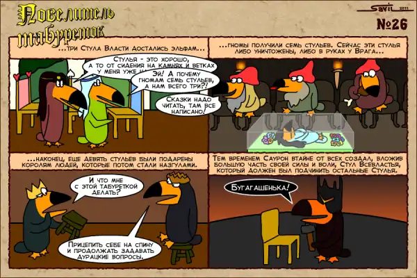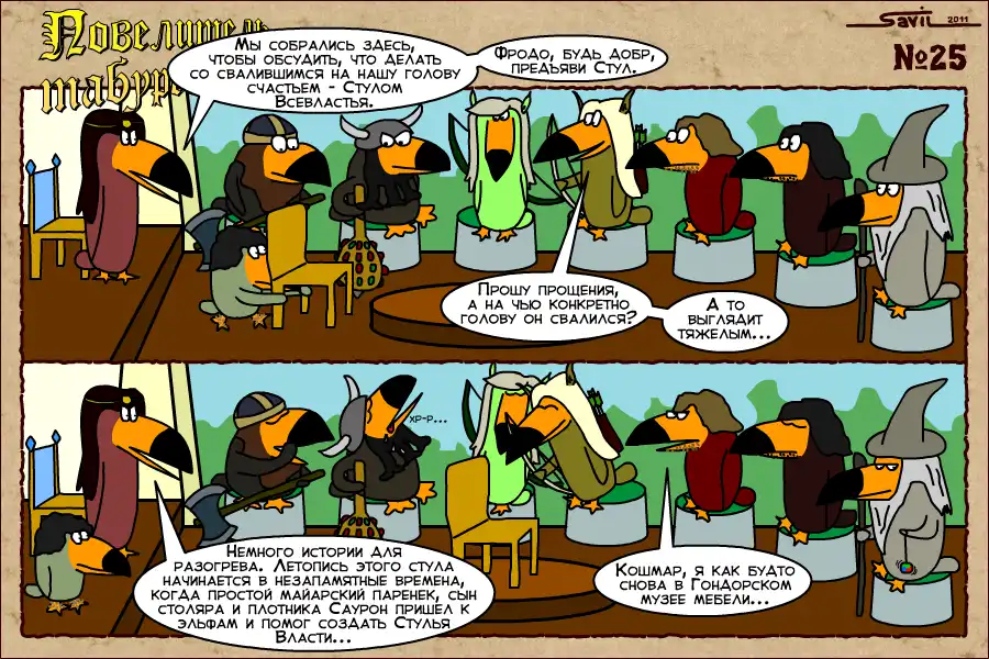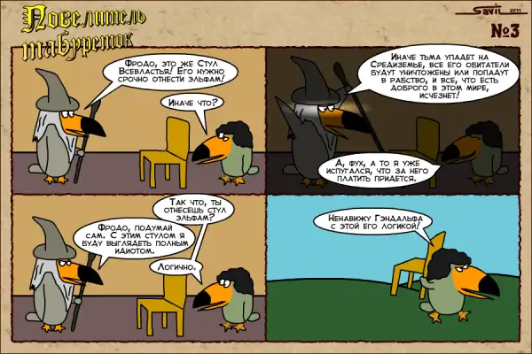 Для всякой вселенной существует альтернативная вселенная. Из чего следует, что для всякой альтернативной вселенной тоже существует альтернативная вселенная. И, значится, в одной из версий многострадального Средиземья Саурон сдуру выковал вместо кольца Стул Всевластья. А в остальном все осталось по-прежнему, и никто не пострадал. За исключением, разве что, хоббитов, которым этот стул теперь переть черт знает куда.