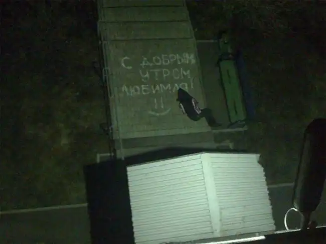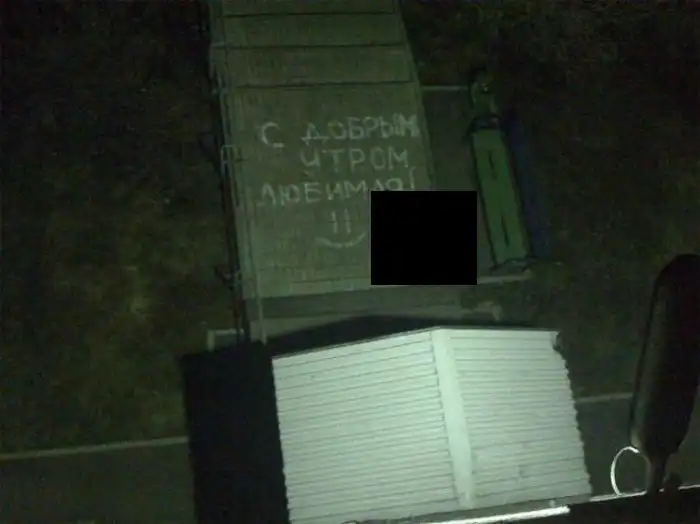 Парень решил сделать приятное своей девушке, он взял мелки и написал приятные слова перед ее окном.