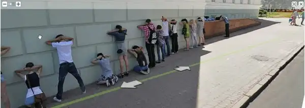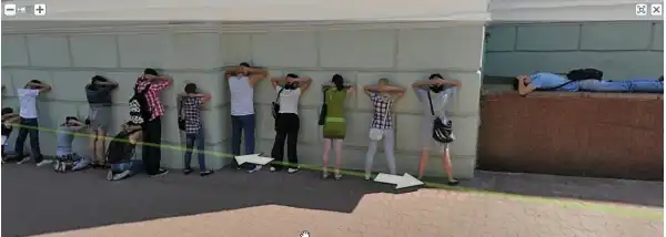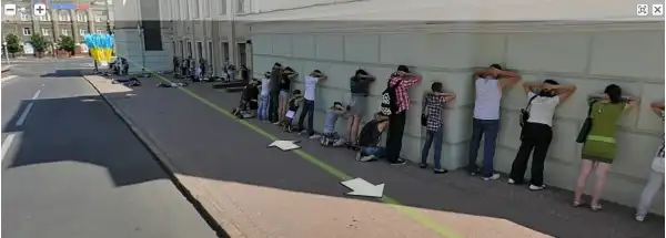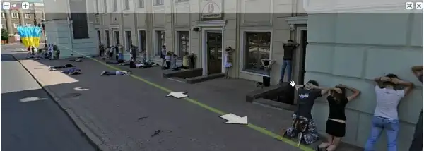 Не только на западе любители поиздеваться над онлайн-сервисами подстерегают «гуглмобиль», фотографирующий улицы. «Яндексмобилю» тоже иногда достается . В апреле 2011 года жители Донецка, украинского областного центра, видимо, решили пошутить на тему местных стереотипов. В Украине город славится как столица организованной преступности, а сами его жители говорят, что это город трех «Б»: бандиты, бабушки и порочные женщины. Бабушек на получившемся снимке нет, порочность присутствующих женщин установить невозможно, но явно здесь происходит нечто нехорошее...