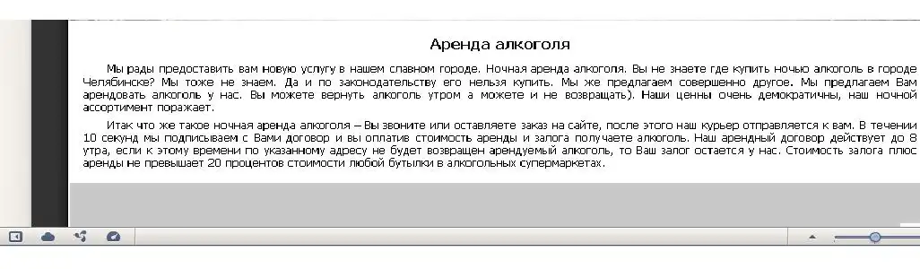 Мы рады предоставить вам новую услугу в нашем славном городе. Ночная аренда алкоголя. Вы не знаете где купить ночью алкоголь в городе Челябинске? Мы тоже не знаем. Да и по законодательству его нельзя купить. Мы же предлагаем совершенно другое. Мы предлагаем Вам арендовать алкоголь у нас. Вы можете вернуть алкоголь утром а можете и не возвращать). Наши ценны очень демократичны, наш ночной ассортимент поражает.