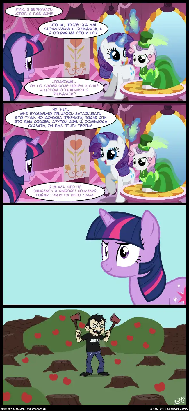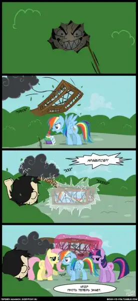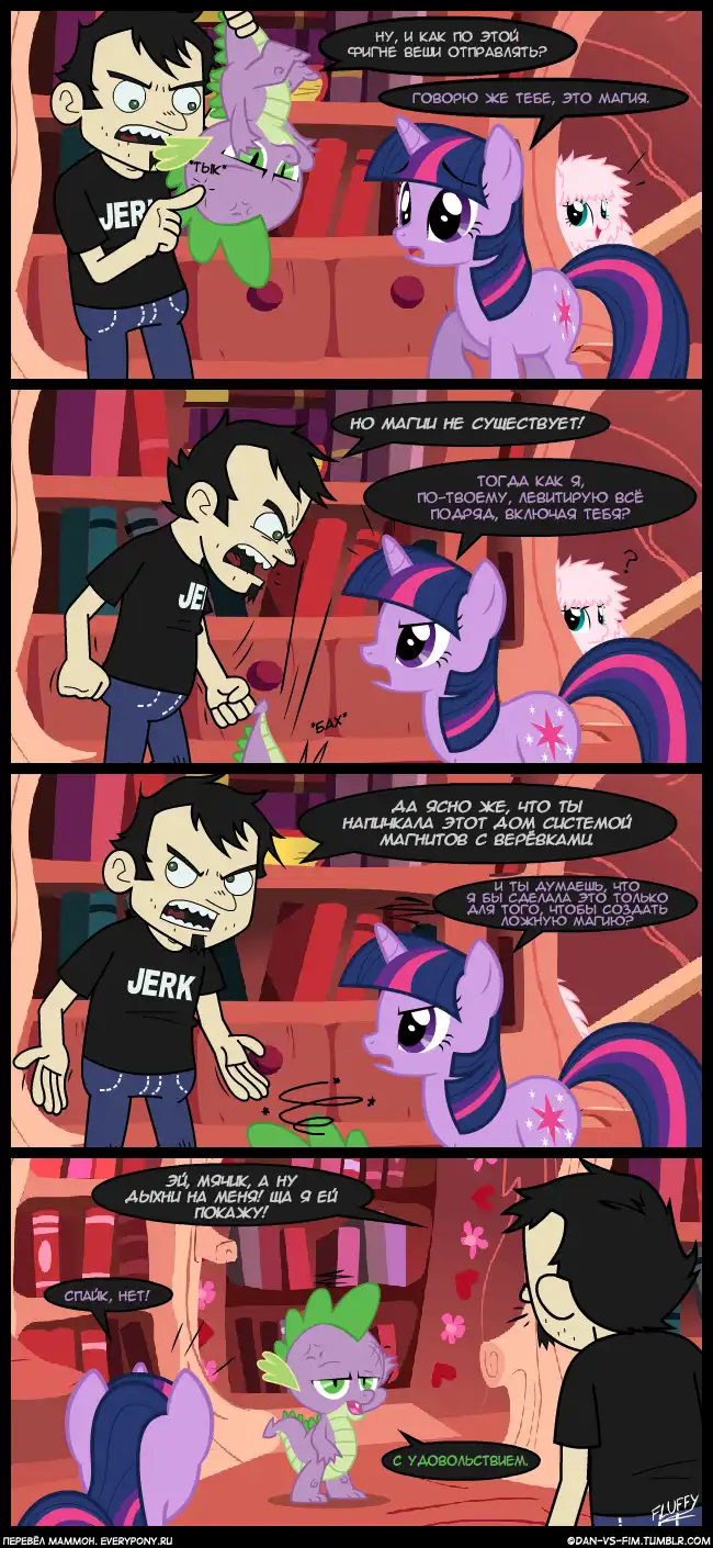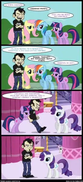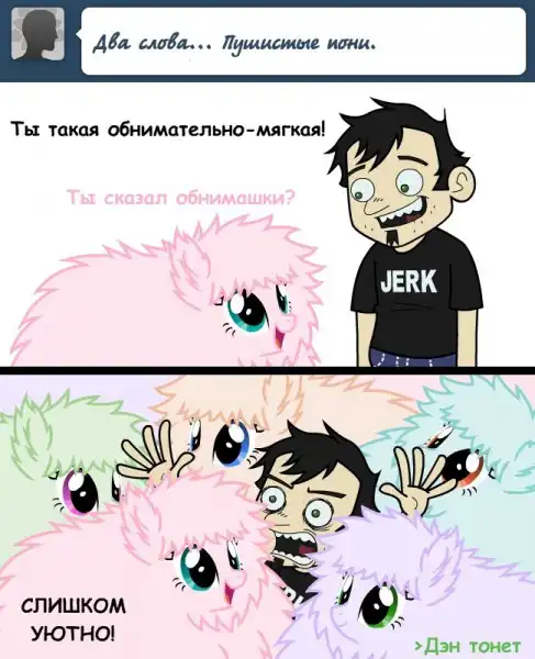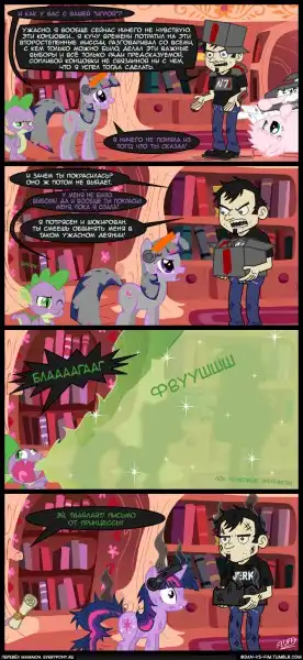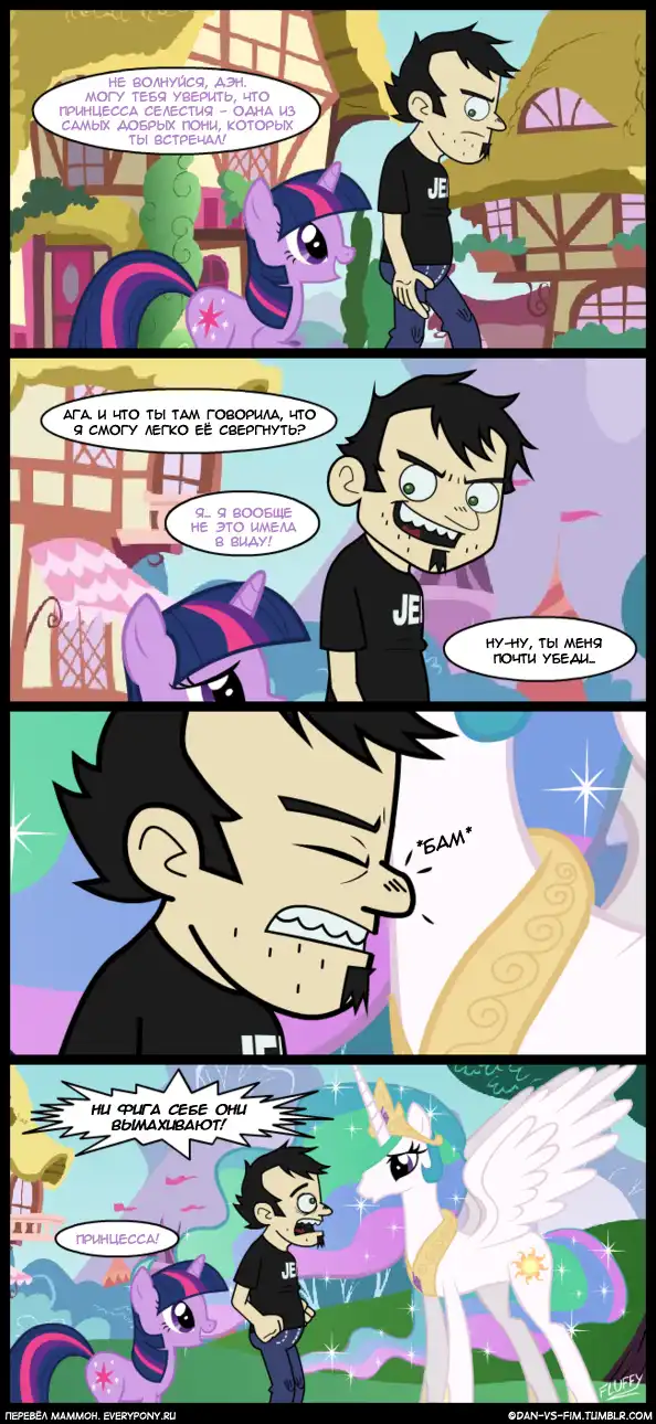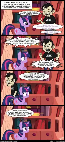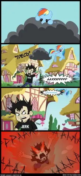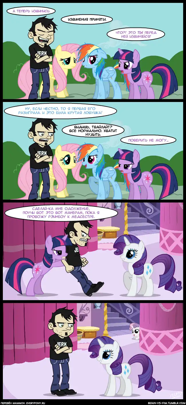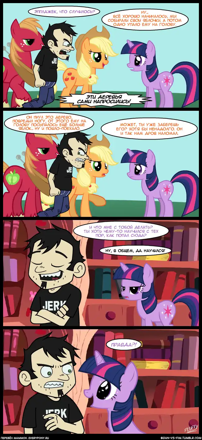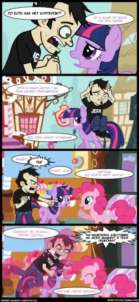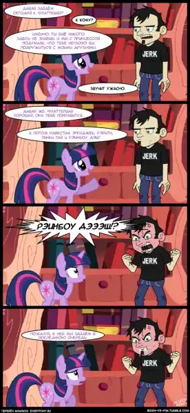 В продолжение моего прошлого поста для заинтересованных я представляю вам комиксы о герое Дэне, который попал в Ponyville, благодаря его "веселым друзьям". Дэну кажется, что весь мир настроен против него и ведет себя "немного" агрессивно, что и объясняет его надпись на футболке "JERK", что означает задира. Прочитав этот пост вы станете на 20% круче! yaaaaaay!