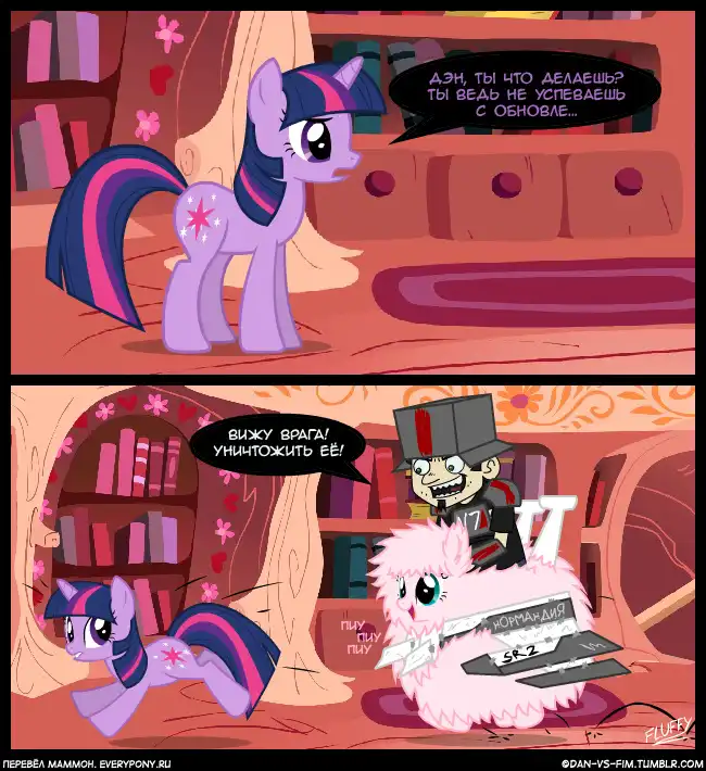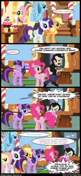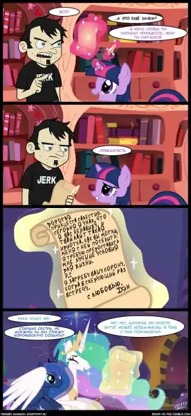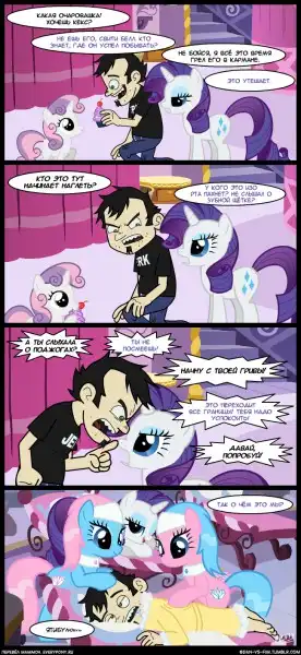 Дальше сюжет идет отдельный и ему пишут пользователи и из-за этих комментариев и разворачиваются мини-сюжеты. В одном из комиксов вам попадется брони-мем Молестии. Это не самая приятная тема, но все же комикс я выложу. Так же вы увидите пушистого пони, которое в шоу не было добавлено, но оно планировалось, ибо этого персонажа тоже рисовала Лоурен Фауст и это был "её любимый персонаж". Сперва выложу сюжет подлиннее и с этой "Молестией".