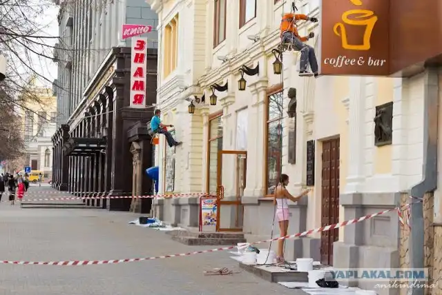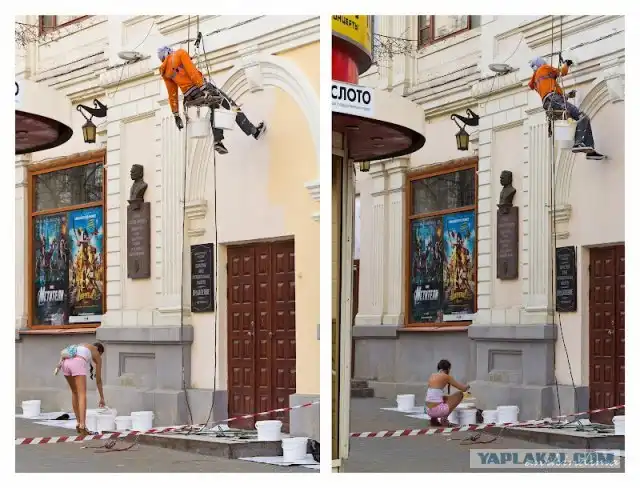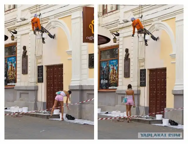 Вдруг наблюдаю такую картину - длинноногая стройная девочка, дососав свой чупа-чупс, поднимается со скамейки и направляется к малярам, что красили неподалеку фасад кинотеатра. С минуту с ними переговаривается, а потом.....