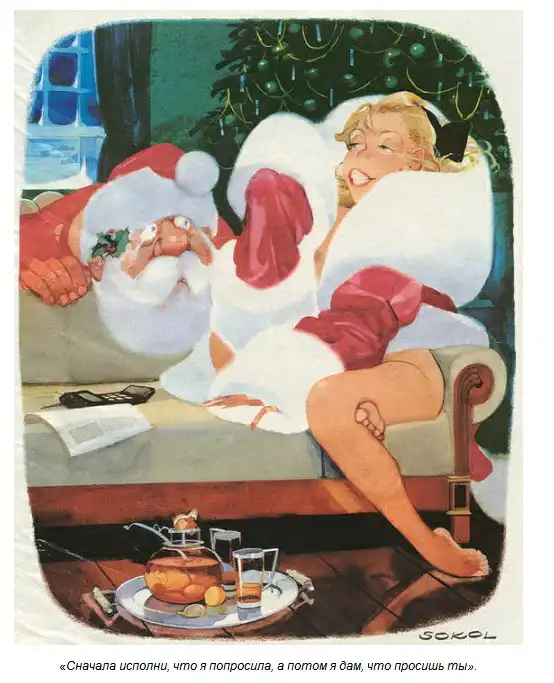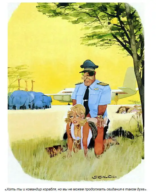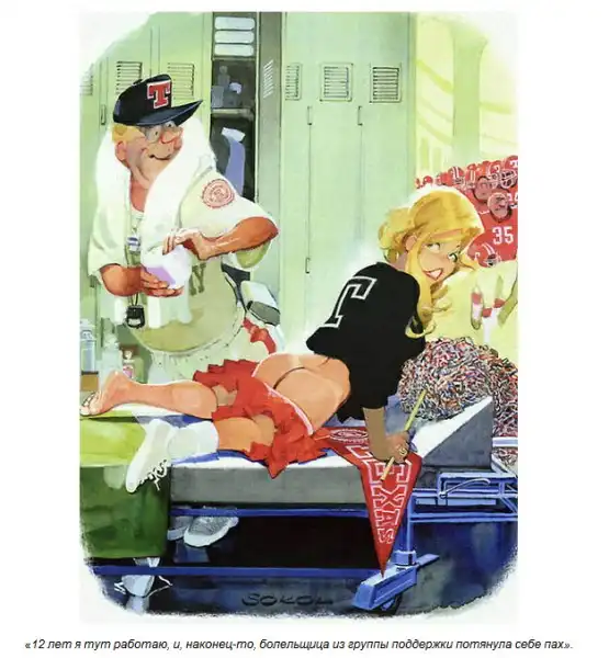Сокол обладал великолепным чувством света, цвета и атмосферы. Главными героями его работ (а точнее героинями) всегда оставались красотки со сногшибательными формами тел. Прям смотришь и "Ухтыжептить!!!! ". Но, если присмотреться внимательней, рядом с красивыми девушками всегда оказываются представители сильного пола – то это толстый врач, то бушующие генералы и командиры, то типичные представители офиса, то богатенькие старикашки, которые пускают слюни от одного взгляда на тело девушки. Даже Санта! Именно в этом и просматривается прекрасный юмор Сокола. Актуальные сюжеты-то! Тонко! Даже в наши дни!