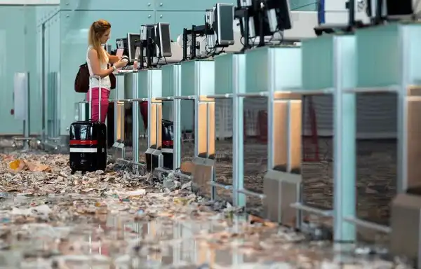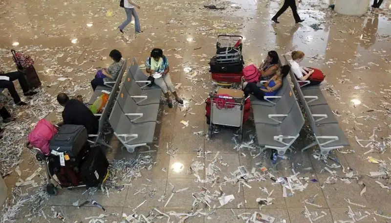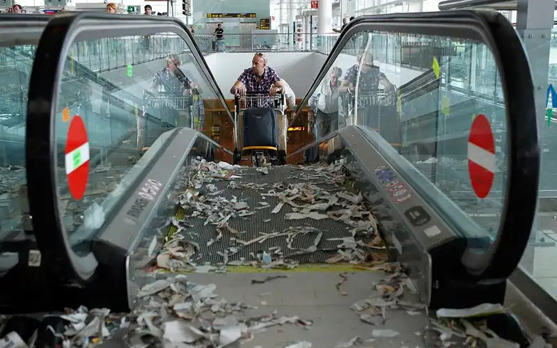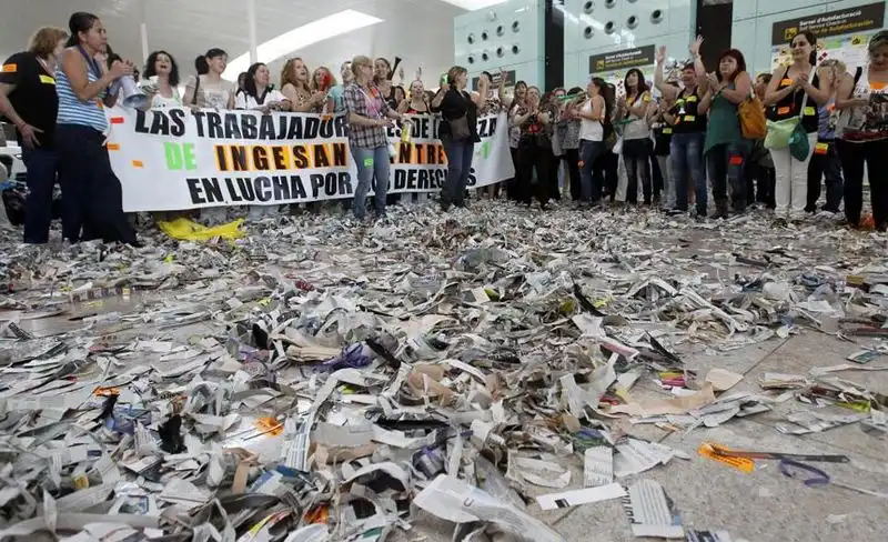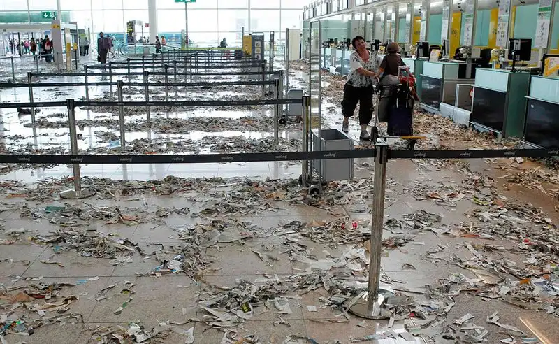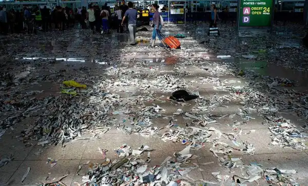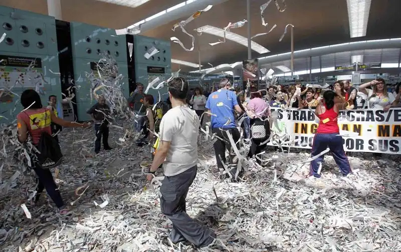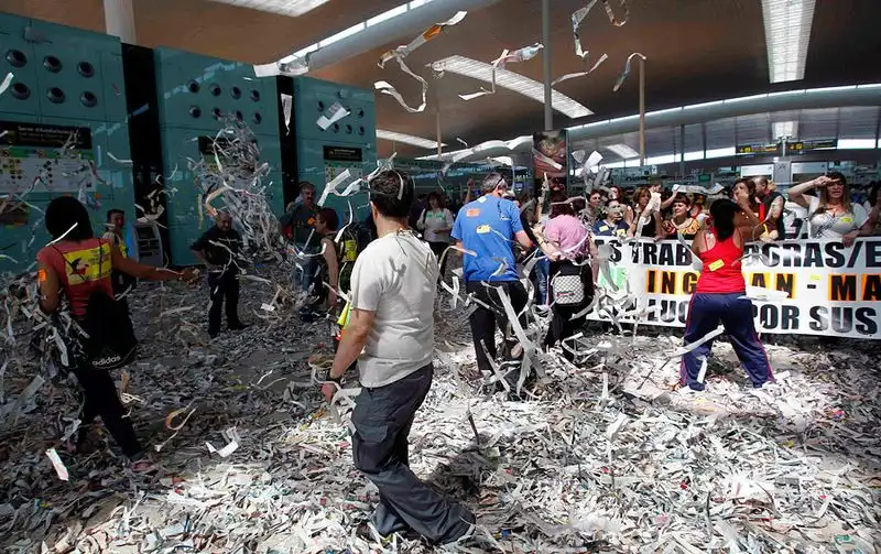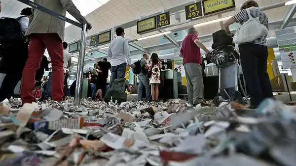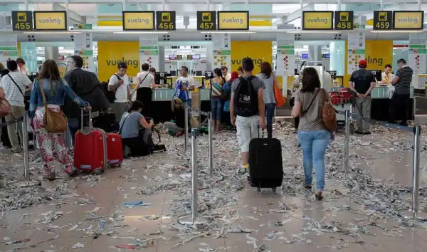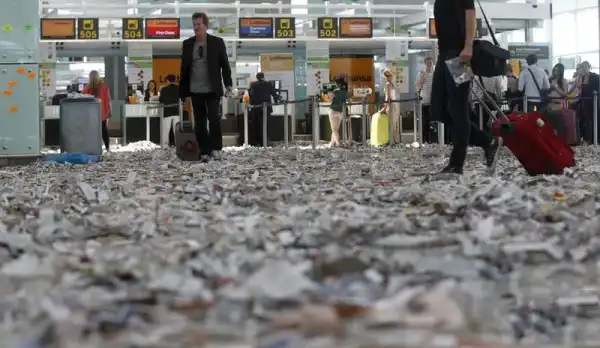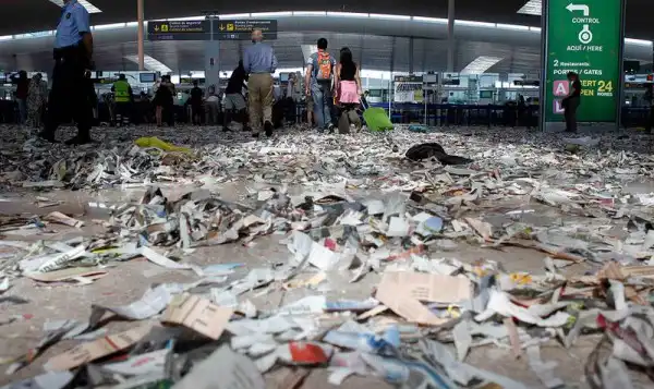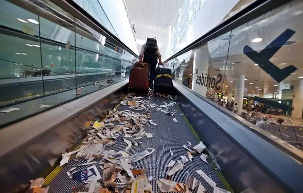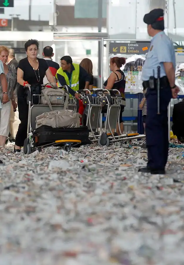Это аэропорт Барселоны Эль Прат. Горы мусора под ногами пассажиров приятно радуют гостей Каталонии.