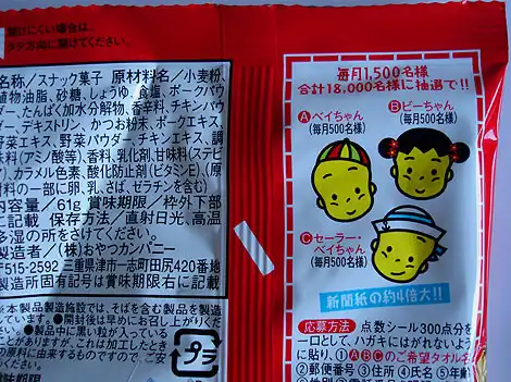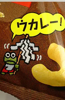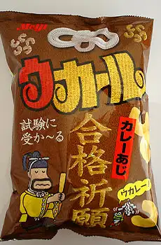 Ещё одна сезонная вещь.Чипсы "Uka-ru". Это слово означает "вступать", то есть поступать в университет, пройти испытание. Чипсы продаются в то время года, когда абитуриенты поступают в высшие учебные заведения. Чтобы пройти экзамены, они обычно идут в храм, чтобы помолиться. Покупая чипсы в этой упаковке, вы тем самым берете себе «личного священника», и вместо того, чтобы тратить время на прогулки, «молитесь» над учебниками: