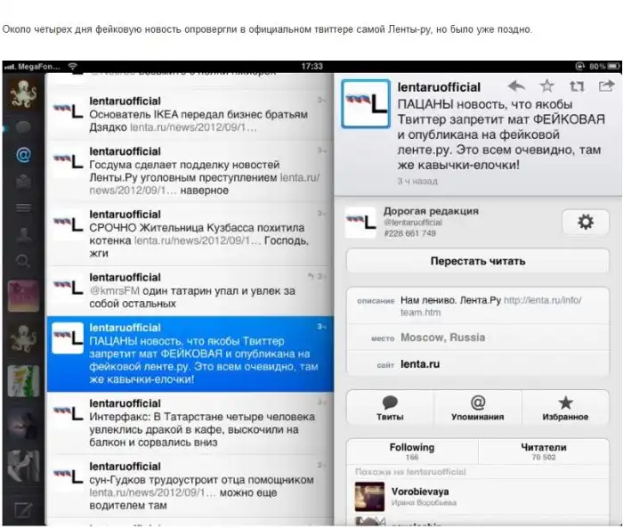Один блоггер решил немного развлечься и создал фейк страницы Ленты.Ру о том, что в Твиттере вводится цензура, а все страницы, содержащие "крепкие выражения" будут удалены. Шалость удалась, и это вызвало довольно бурную реакцию микроблогов ;)