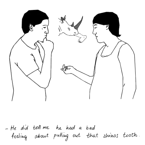 («Он сказал, что у него плохое предчувствие относительно вырывания зубов у носорога».)