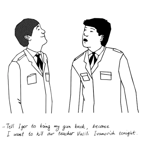 («Скажи Игорю, чтобы вернул мой пистолет, потому что вечером я собираюсь замочить нашего учителя Василия Ивановича».)