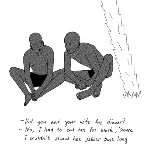 («Ты съел свою жену на ужин?» — «Нет, пришлось съесть ее на обед: я бы не выдержал ее болтовню так долго».)
